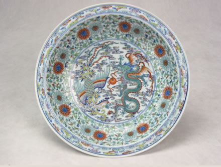 清雍正款斗彩龍鳳大盤:此盤為白地斗彩大盤,盤內飾斗彩龍鳳戲珠紋,一條行云五爪飛龍,龍身蜿蜒矯健,鳳舞展翅穿于祥云之間,呈龍飛鳳舞圖案。盤外飾海水江崖,壽山福海。壽山上靈芝盛開,云蝠翩翩。底“大清雍正年制”六字兩行雙圈青花楷書書款。整個大盤胎質細膩,釉色純正,造型規(guī)矩,為清宮祝壽時的御用器皿。