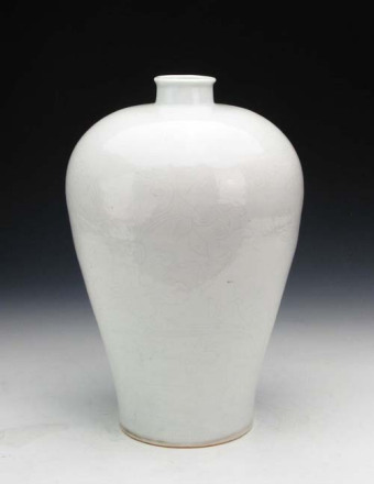 明永樂白釉暗串枝蓮花梅瓶:小口,圓唇,短頸,豐肩。器物紋飾為劃花,器物肩部上下各兩道弦紋,中間為靈芝纏枝花紋,八顆靈芝首尾相接,纏枝不斷。腹部兩組大荷葉蓮花,每組為三朵蓮花并蒂爭相開放,神態(tài)各異。此瓶為明永樂時期景德鎮(zhèn)官窯器,甜白釉,白中閃青。釉色白瑩,光亮潤澤,胎質細潔,整個器物造型規(guī)矩。肩部圓潤略顯豐滿。底足為平底。