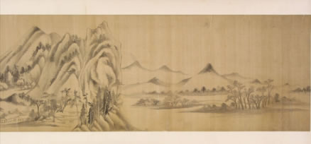 董其昌仿米黃山水圖卷:明晚期,絹本。用筆參以披麻與米點皴法,為其自家面貌。卷后部行書自題:“家有黃子久《富春大嶺圖》、米元暉《瀟湘圖》,和會兩家筆意為此卷,大都子久畫出于巨然與海岳父子同參也!焙笫鹂睿骸岸鬃R”,下鈐“知制誥日講官”、“董其昌印”白文印二方?顐肉j“楨父審定”、“墨緣堂來氏收藏書畫記”二印。