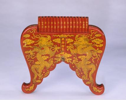 清乾隆款朱漆描金云龍紋排簫:通體遍涂朱紅彩漆,大部分為木制,刻成獸腿開叉形狀,腿下部雕成云頭形狀。雙面均描金繪二龍戲珠、浮云、火焰圖案,在正面火焰珠位置為長條方池,內有金漆楷書“乾隆八年制”年款。排簫上部為單排十六根竹管,用于吹奏之用,管上正面各以金漆書寫楷書律名,從左至右依序為“倍夷則”“倍無射”“黃鐘”“太簇”“姑洗”“蕤賓”“夷則”“無射”“應鐘”“南呂”“林鐘”“仲呂”“夾鐘”“大呂”“倍應鐘”“倍南呂”。排簫底部系有一條五彩流蘇。