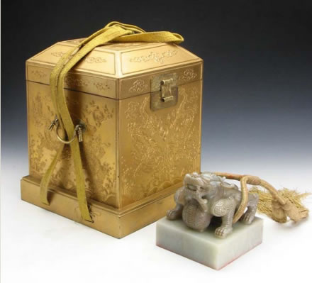清世宗憲皇帝謚寶:此寶為嘉慶四年(1799)清宮內府遵旨由舊寶改鐫而成。寶上部為單體蹲龍紐,描金,紐上系明黃絲繩。謚寶文字為滿、漢文合璧,均為朱文,右側為漢文篆書四行,左側為滿文篆書四行。其文為“世宗敬天昌運建中表正文武英明寬仁信毅睿圣大孝至誠憲皇帝之寶”。謚寶外包明黃織金四則團花暗云紋錦包袱皮,用雙層龍鳳紋金漆套盒盛裝。該寶于嘉慶四年改鐫后由北京送至盛京太廟尊藏,清末民國時期存于沈陽故宮崇謨閣內。
