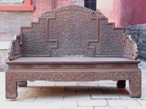 保極宮內正中暖軒上方,高懸嘉慶御筆“高林萬象”匾,意思是皇帝居于萬物之上,在暖軒中央設龍紋明黃坐具一副,清帝東巡時,就在此召見親近王公。清代題材影視劇中的召見場面,皇帝與大臣往往光頭、便服,其實這在清代是絕對不允許的。大臣覲見須著常服補褂朝珠,戴紅纓官帽;实垡彩浅7酃又。常服是皇帝在宮中正式場合所穿禮服,用為處理一般政務或召見大臣。官員亦如是,按清制穿錯朝服最輕也要罰俸一月,因為這是清代制度所嚴格規(guī)定的,即以天子之尊,亦不能違背。值得一提的是,暖軒黃座兩旁各有一個紫檀高柜,象征著皇帝身份的高貴至尊。在皇帝寢宮里的柜子從不裝滿東西,意味富貴有余,寢宮的的床又長又窄意味著長壽,而枕頭特別高,意味著高枕無憂。