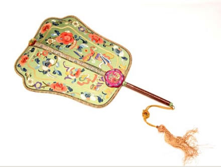 清紅木柄綠緞彩繡博古紋扇:此扇為多弧邊長方形,扇頂微向后彎曲,扇面為綠色緞制,滿繡五彩花卉、博古紋飾,另有金錢壓紋邊,扇中骨及邊緣均用彩繡錦邊制成。扇面與柄桿交接處有紅緞五瓣梅花形裝飾,花內繡有佛手、瓜、桃及五蝶圖案。扇柄為紅木制成,刻有花卉紋,柄兩頭鑲有綠色骨飾。柄頭系黃色絲穗。