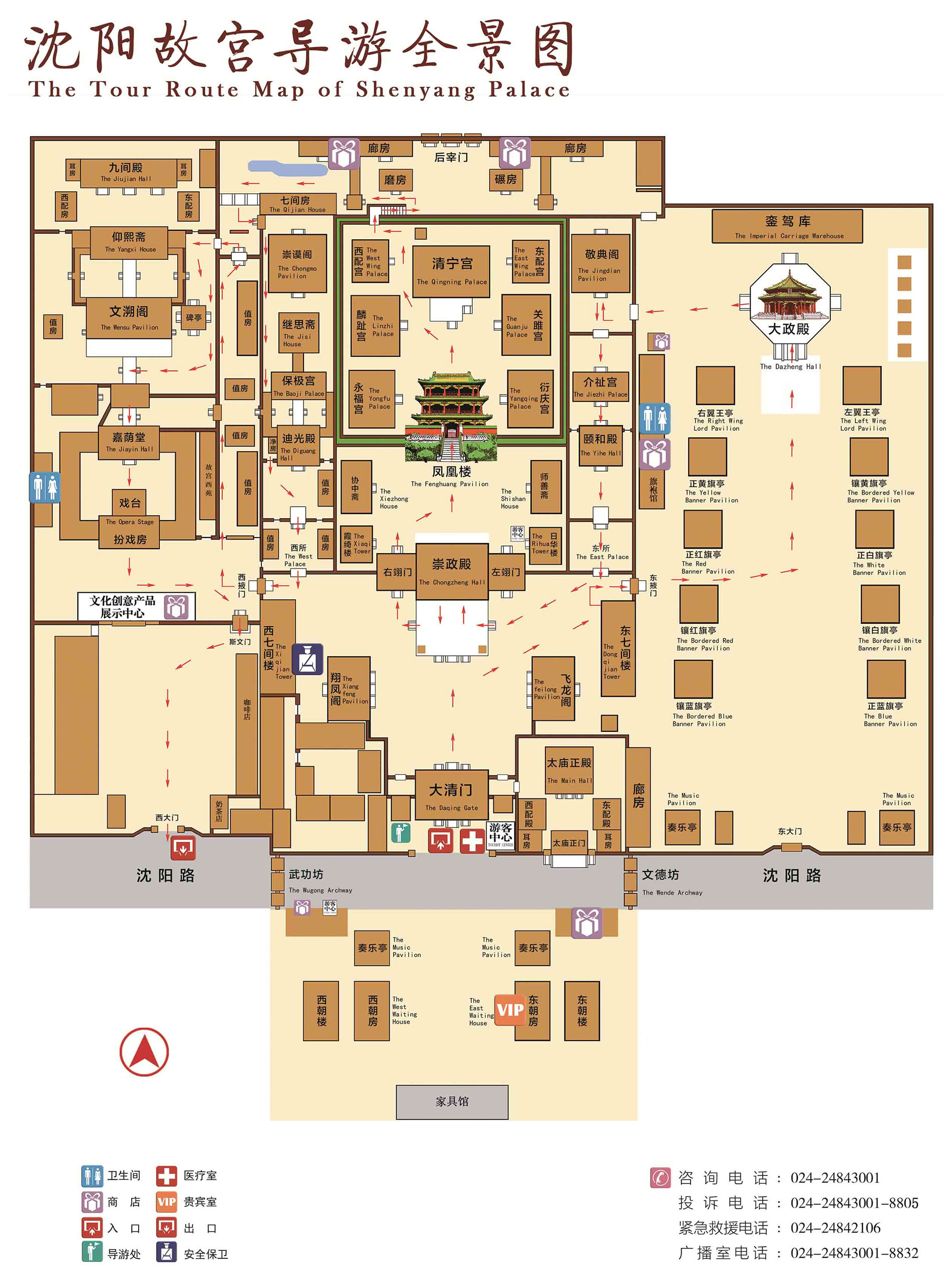 中路為整個建筑群的中心,分前后3個院落。南端為照壁、東西朝房、奏樂亭;前院有大清門、崇政殿、飛龍閣、翔鳳閣;中院有師善齋、協中齋、鳳凰樓;后院是以清寧宮為主的五宮建筑。中院和后院兩側各有一跨院,稱東宮、西宮。東宮有頤和殿、介祉宮、敬典閣;西宮有迪光殿、保極宮、繼思齋、崇謨閣。大清門是沈陽故宮的正門,是文武群臣候朝之處,為五間硬山式建筑,正脊、垂脊及兩山的“墀頭”均以五彩琉璃鑲造。崇政殿是故宮的正殿,建于后金天聰時,是清初朝會之所,為五間九檁硬山式,俱辟隔扇門,前后有出廊,圍以石雕欄桿。頂蓋黃琉璃瓦鑲綠剪邊,殿內徹上明造,梁架全部為和璽彩繪。殿前東置日晷,西設嘉量。殿后是鳳凰樓,同清寧宮、關睢宮、衍慶宮、永福宮、麟趾宮五宮建在近4米的高臺之上,四周繞以高墻,獨成一座宮院。