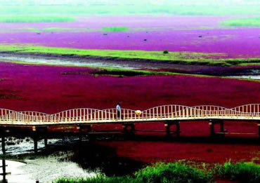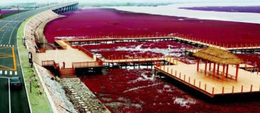 這里是遼河口和渤海的交界處,兩河水不斷地沖刷翅堿蓬,翅堿蓬會(huì)越來越紅。初一、十五大潮時(shí)海水蓋過翅堿蓬,成為一片大海的奇觀,潮落后,鮮艷的翅堿蓬依然矗立在泥潭中。