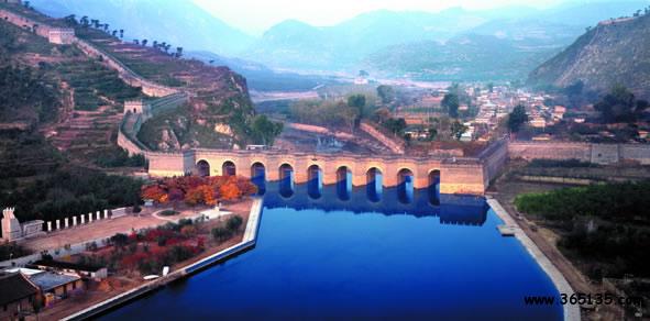 九門(mén)口長(zhǎng)城:坐落在遼寧省綏中縣李家鄉(xiāng)新臺(tái)子村境內(nèi),距山海關(guān)15公里,全長(zhǎng)1704米。其南端起于危峰絕壁間,與自山海關(guān)方向而來(lái)的長(zhǎng)城相接。自此,長(zhǎng)城沿山脊向北一直延伸到當(dāng)?shù)氐木沤幽习,在寬達(dá)百米的九江河上,筑起規(guī)模巨大的過(guò)河城橋,以此繼續(xù)向北逶迤于群山之間。“城在水上走,水在城中流。”便是人們對(duì)九門(mén)口長(zhǎng)城的形象描述。