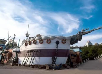 海盜村以海盜和海盜景物的卡通造型,對所有建筑,游樂設施、休閑場所,景觀進行包裝。一期工程中的海盜船,是國內僅有的架設在海灣海平面上的海盜船。它的支點高13.5米,最大擺角120度,每船可以乘游客40人。