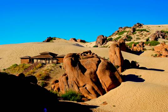 赤峰市西拉沐淪河兩岸,是著名的科爾沁沙地的組成部分,有“八百里瀚海”之稱。翁牛特旗的其甘、布日敦、勃隆克山等地,是典型的科爾沁沙地發(fā)育區(qū)。到此旅游,既可以一睹“長河落日圓,大漠孤煙直”的沙漠風采,又可以體味沙漠與綠洲、湖泊相生相伴的沙地獨特景觀。