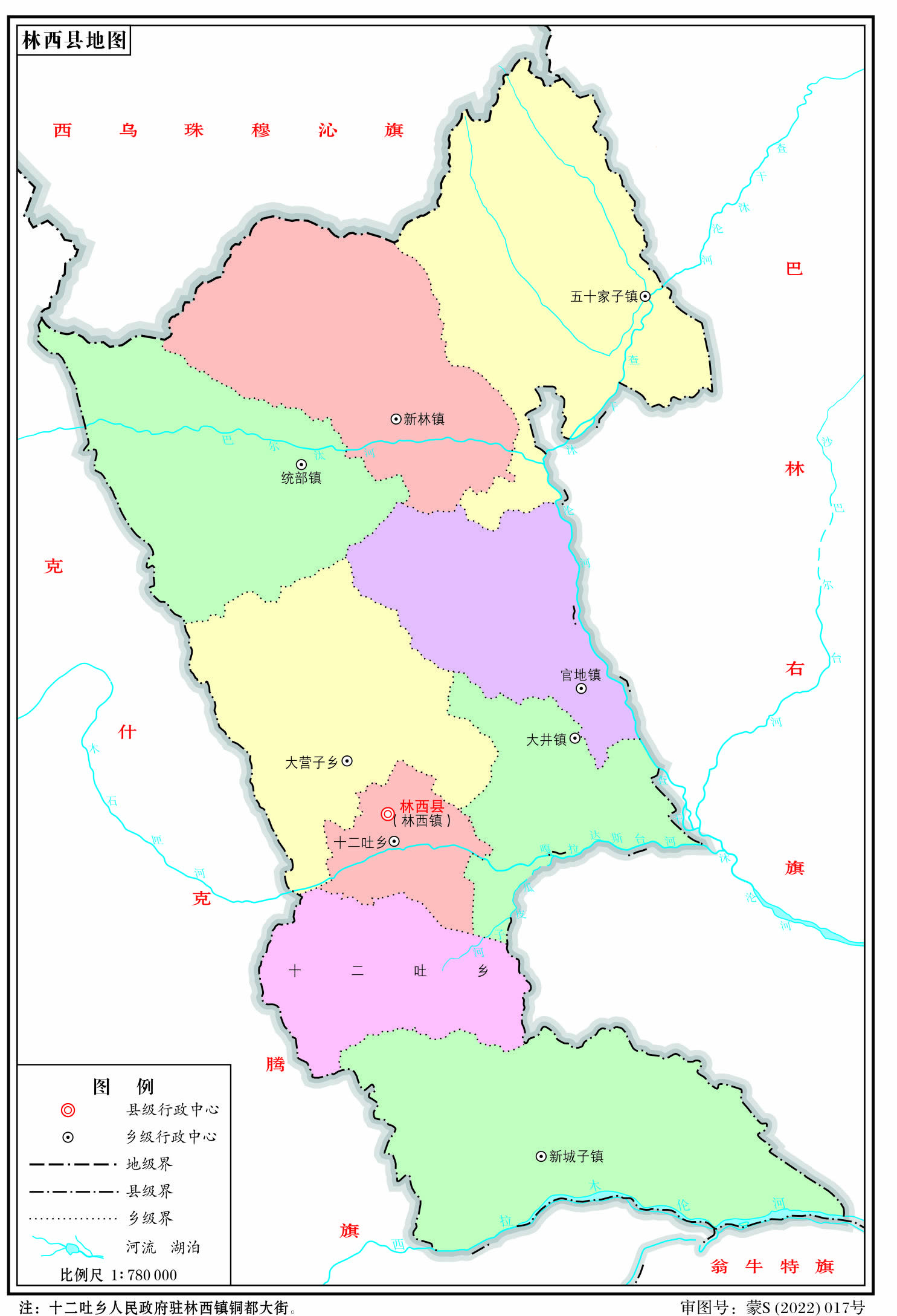 鎮(zhèn):官地鎮(zhèn)、新城子鎮(zhèn)、新林鎮(zhèn)、五十家子鎮(zhèn)、林西鎮(zhèn)、大井鎮(zhèn)、統(tǒng)部鎮(zhèn)