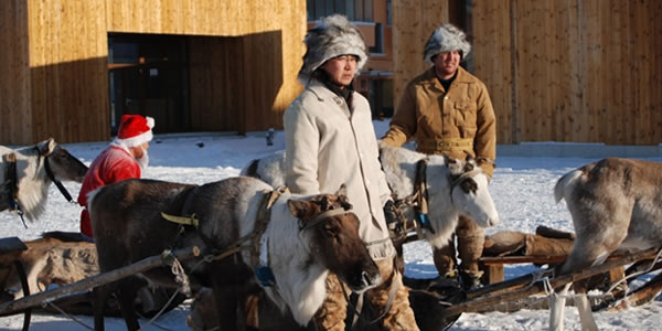 敖 生態(tài)環(huán)境 這里是森林與草原的界線,大興安嶺和呼倫貝爾大草原在這里交匯,一邊是草原、河流,一邊是森林、山崗,空氣新鮮,野味十足,當(dāng)?shù)厝税氘?dāng)真的說"這地方絕對沒有污染,連蒼蠅、蚊子都是綠食食品"。 國家給敖魯古雅鄉(xiāng)人建立了定居地,但馴鹿只能生活在森林里,所以除了在定居點的部分村民,密林中還散布著五個馴鹿站,最遠(yuǎn)的在150公里。過去,敖魯古雅人養(yǎng)馴鹿只是作為運輸工具,一頭馴鹿可以負(fù)重35公斤左右,每小時可以行走5公里,1964年,取得了割鹿茸成功。現(xiàn)在,馴鹿已經(jīng)不大用來運輸了,而成了當(dāng)?shù)厝说闹饕?jīng)濟(jì)來源,中國唯一的這群馴鹿大約只有10000只左右了。 敖鄉(xiāng)民俗村 敖魯古雅鄂溫克民俗村位于根河市西郊,南臨S301國道,交通十分便利。民俗村總建筑面積58,700平方米,是集大中型會議、休閑度假、民俗展示、娛樂為一體的綜合性旅游度假村,是一處自然——人文旅游 景觀。 民俗村依托森林、河流,鄂溫克獵民的民俗民風(fēng),推出一系列具有地方特色的旅游活動項目:主要有森林觀光、探險、模擬狩獵;觀民族宗教、歌舞、民俗表演;品嘗民族風(fēng)味餐、參觀敖鄉(xiāng)新居、訪獵民等活動;村內(nèi)建有木質(zhì)別墅式的游客服務(wù)中心,民俗文化博物館、民俗表演平臺、表演廳和餐廳、反映鄂溫克獵民歷史的圖騰廣場、有四十、五十、六十年代不同的撮羅子,有上山索道車、木橋和四處風(fēng)格獨特的獵民點;還有民俗表演隊和馴鹿車穿行其中,可對敖魯古雅鄂溫克獵民的歷史、文化、宗教、習(xí)俗進(jìn)行了充分的展示。 敖魯古雅鄉(xiāng)距離我國最北端的漠河縣約一百公里左右的路程,位于大興安嶺深處的滿歸林區(qū)。這里氣候十分寒冷,記者走在蜿蜒的山路上,腳下的積雪發(fā)出“咯吱咯吱”的脆響,眼前已是呵氣成冰,身上的棉襖凍得硬梆梆的。隨行的鄉(xiāng)黨委書記鮑玉林說:“現(xiàn)在大約是零下30攝氏度,你們趕上好時候了,往年這個時候得有零下五十度,外面到處冒白煙。” 敖魯古雅鄉(xiāng)有一條主干道,長不過二三百米。道兩邊是整齊的幾排木刻楞房和磚瓦房,象征著主人的富裕程度。敖鄉(xiāng)雖小,卻擁有自己的博物館、學(xué)校、文化站和小商店。春節(jié)雖過,但喜慶氣氛尚濃,白雪映襯下,墻上的大紅對聯(lián)分外惹眼。 敖鄉(xiāng)生活著近500人,其中鄂溫克人大約有230人。他們現(xiàn)在已經(jīng)是獵民定居后的第三代了。在離此50到100多公里的山林中,還有四個獵民點,生活著30多名習(xí)慣于打獵和在山上飼養(yǎng)馴鹿的老獵民們。