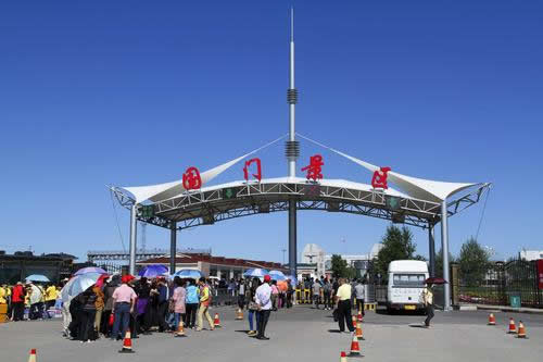 國門莊嚴肅穆,在國門乳白色的門體上方嵌著“中華人民共和國”七個鮮紅大字,上懸掛國徽,國際鐵路從下面通過。