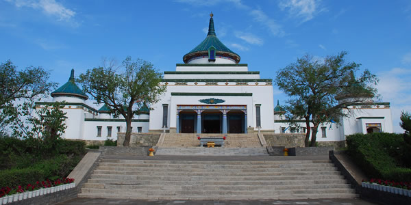成吉思汗廟坐落在興安盟烏蘭浩特市罕山之巔,始建成于1940年,這座融漢、蒙、藏三個民族建筑風(fēng)格于一體的廟宇,從正面看是"山"字形。正殿當(dāng)中有16根粗大的紅漆明柱,四周繪有反映成吉思汗業(yè)績的精美圖案,中央為2.8米高的成吉思汗銅像;兩偏殿陳列有元代的兵器,服裝,瓷器等復(fù)制品,山門到正殿有寬10米、長158米用花崗巖砌成的81級臺階。成吉思汗廟融蒙、漢 、藏三個民族的建筑風(fēng)格于一體, 采取古代漢族建筑中慣用的中軸對稱布局手法,建筑主體圓頂方身,綠帽白墻,具有典型的蒙、藏建筑特色。