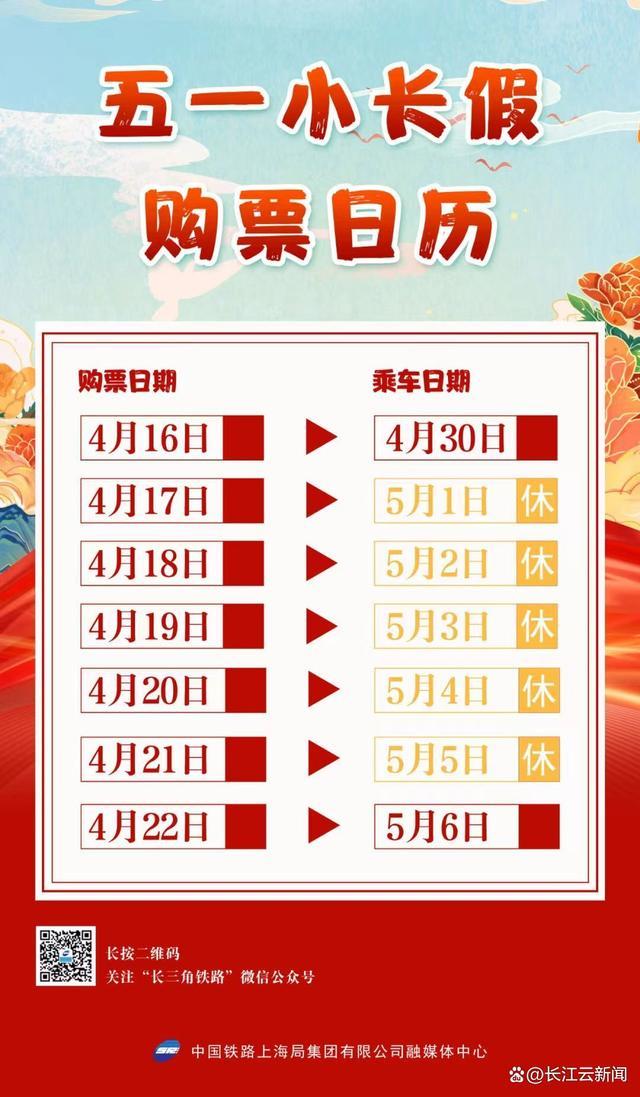 4月16日,五一小長(zhǎng)假前一日(4月30日)火車票正式發(fā)售。2024年五一小長(zhǎng)假自5月1日至5月5日止,共5天。根據(jù)目前鐵路客票提前15天預(yù)售的規(guī)則類推,4月16日開(kāi)售4月30日火車票;4月17日開(kāi)售5月1日假期首日火車票;4月21日開(kāi)售5月5日假期最后一天火車票。