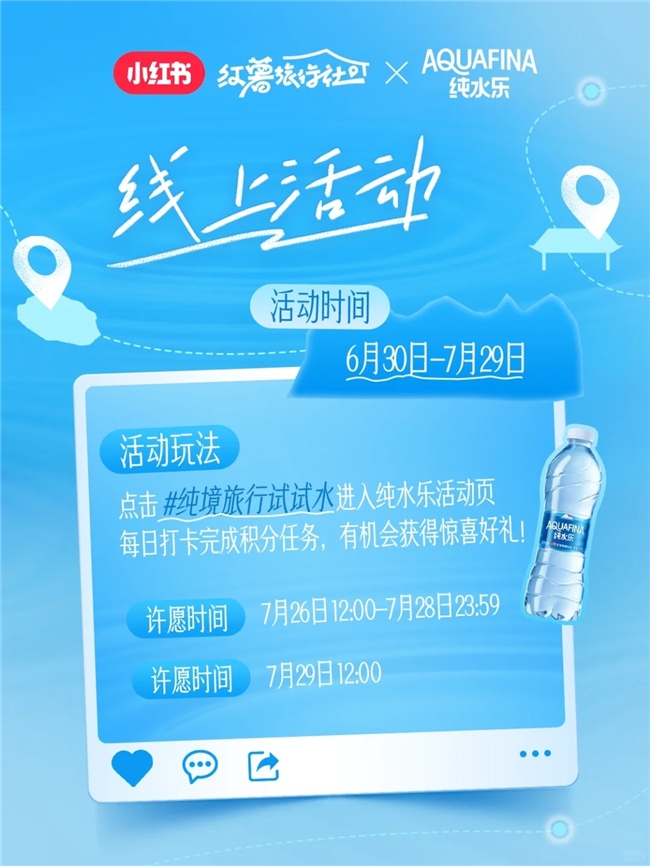 貼合旅行魅力,一場(chǎng)線上線下聯(lián)動(dòng)的全新旅行玩法就此展開。@AQUAFINA純水樂 官方賬號(hào)在小紅書發(fā)布游玩號(hào)召視頻官宣活動(dòng),分享這場(chǎng)“水是純凈的,心是自由的”旅行概念。小紅書@好好玩情報(bào)局 承接活動(dòng)外放,介紹線上線下活動(dòng)玩法,正式開啟為期一個(gè)月的攢積分任務(wù)限時(shí)許愿贏好禮活動(dòng),以趣味性互動(dòng)玩法、豐厚的獎(jiǎng)勵(lì)機(jī)制吸引用戶主動(dòng)關(guān)鍵詞搜索、品牌筆記瀏覽、品牌主頁(yè)關(guān)注、分享品牌信息,助力純水樂品牌成功將流量變?yōu)榱?ldquo;留量”。