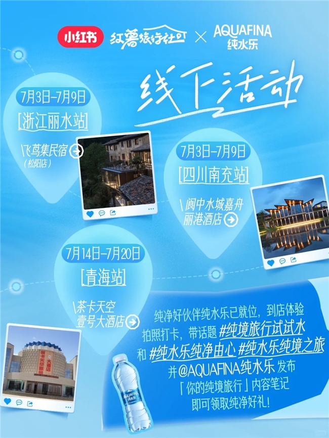 在三位“先鋒試水官”的帶動(dòng)下,四川南充、浙江麗水、青海三大純境路線被更多用戶關(guān)注。純水樂也協(xié)同小紅書在三大純境路線合作的民宿酒店設(shè)置線上線下聯(lián)動(dòng)新玩法。7月3日-7月9日,浙江麗水站飛蔦集民宿(松陽(yáng)店)、四川南充站閬中水城嘉舟麗港酒店線下互動(dòng)贏好禮活動(dòng)率先啟動(dòng),位于青海的茶卡天空壹號(hào)大酒店7月14日-7月20日也很快解鎖加入該活動(dòng)。