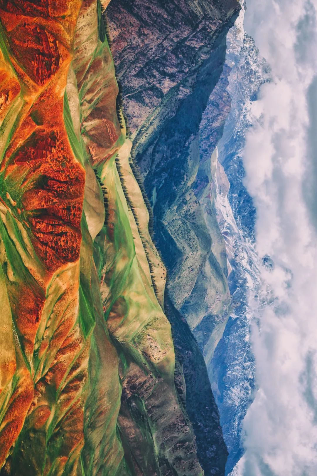 在西北干旱區(qū),從新疆、甘肅的戈壁綠洲到寧夏、陜北的黃土高原,億萬年以來沉積環(huán)境的變化造就了地層中不同化學元素的積累,顯現(xiàn)出深淺不一的色帶,地殼的構造運動使得原本水平的地層發(fā)生不同角度的傾斜和抬升,流水的切割和風沙的吹蝕,將這些延綿不絕的彩色條帶暴露于地表,并斑駁成多種多樣的形態(tài)。