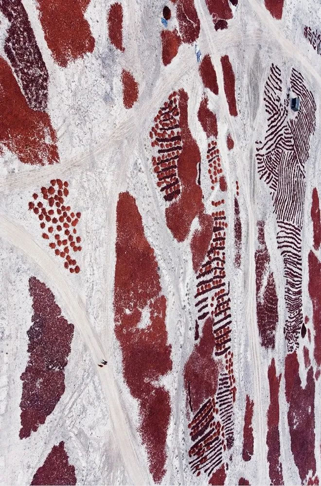 你看,農民們辛勞一年,在他們眼中,果園里紅彤彤的蘋果、深紅的大棗是秋天里可愛的笑臉,寧夏的枸杞也紅了,晾曬時鋪滿大地,斑斕可愛。鋪滿地面的,更有新疆的辣椒,顏色本就極紅,單獨一顆已是十分鮮艷奪目,現(xiàn)在不計其數(shù)的辣椒平攤在戈壁曠野之上,鋪天蓋地連成一片,仿若熊熊烈火燎原,幾乎燒到了天邊。