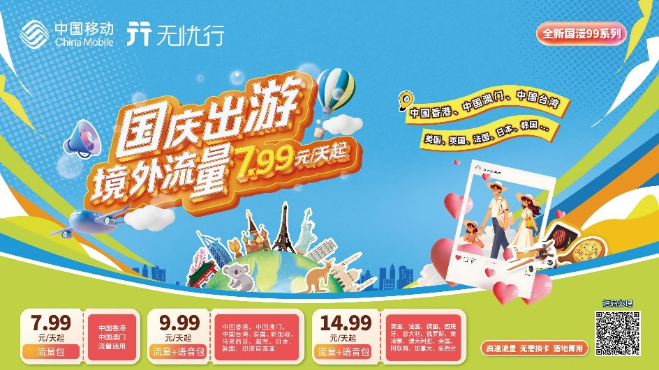 這個(gè)國(guó)慶,想要來(lái)一場(chǎng)說(shuō)走就走的出境游,記得到中國(guó)移動(dòng)APP【首頁(yè)-國(guó)漫專區(qū)】頁(yè)面或無(wú)憂行APP【流量-境外流量】頁(yè)面,選購(gòu)國(guó)漫99系列產(chǎn)品, 出境前記得開通【中國(guó)移動(dòng)國(guó)際/港澳臺(tái)漫游功能】,就可以輕松解決境外通訊問題啦!讓中國(guó)移動(dòng)帶給你高速穩(wěn)定的網(wǎng)絡(luò)體驗(yàn)和服務(wù)。