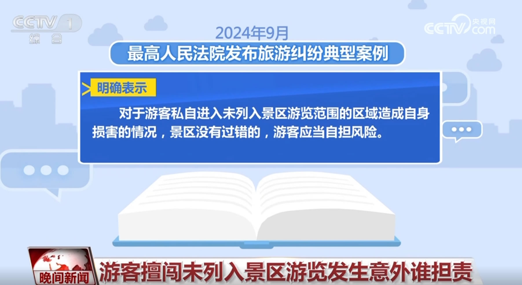 今年9月,最高人民法院發(fā)布旅游糾紛典型案例,明確表示:對于游客私自進入未列入景區(qū)游覽范圍的區(qū)域造成自身損害的情況,景區(qū)沒有過錯的,游客應(yīng)當(dāng)自擔(dān)風(fēng)險。