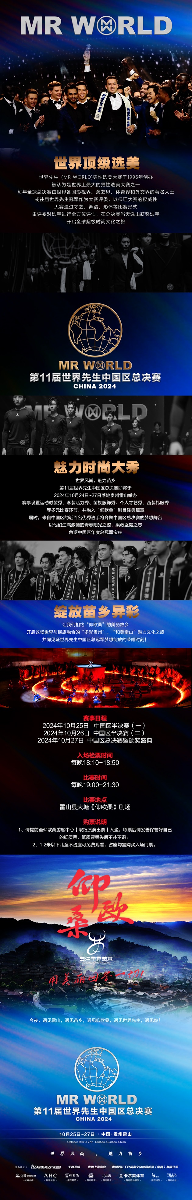 讓我們共同期待 10 月 24 日至 27 日的到來,一起見證“世界先生”們?cè)?ldquo;多彩貴州”、“和美雷山”的精彩表現(xiàn),一起遇見美麗的“仰歐桑”,共同感受這場(chǎng)世界與民族融合的魅力文化盛宴!