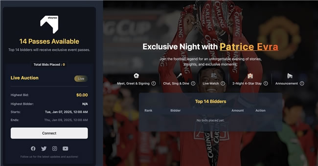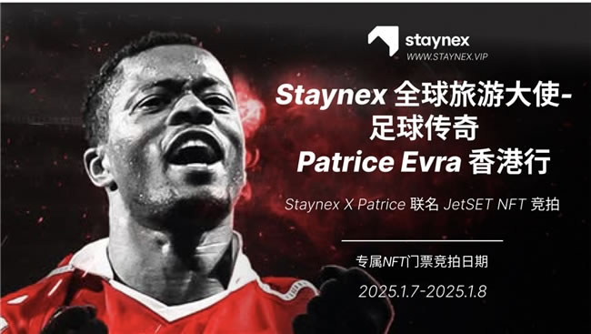 此外,活動(dòng)現(xiàn)場將見證 STAYNEX 與 Patrice Evra 的簽約儀式,并獲取精美禮品、幸運(yùn)抽獎(jiǎng)和獨(dú)家優(yōu)惠。具體相關(guān)權(quán)益或競拍鏈接以及競拍教程請查看STAYNEX.VIP 官方說明。