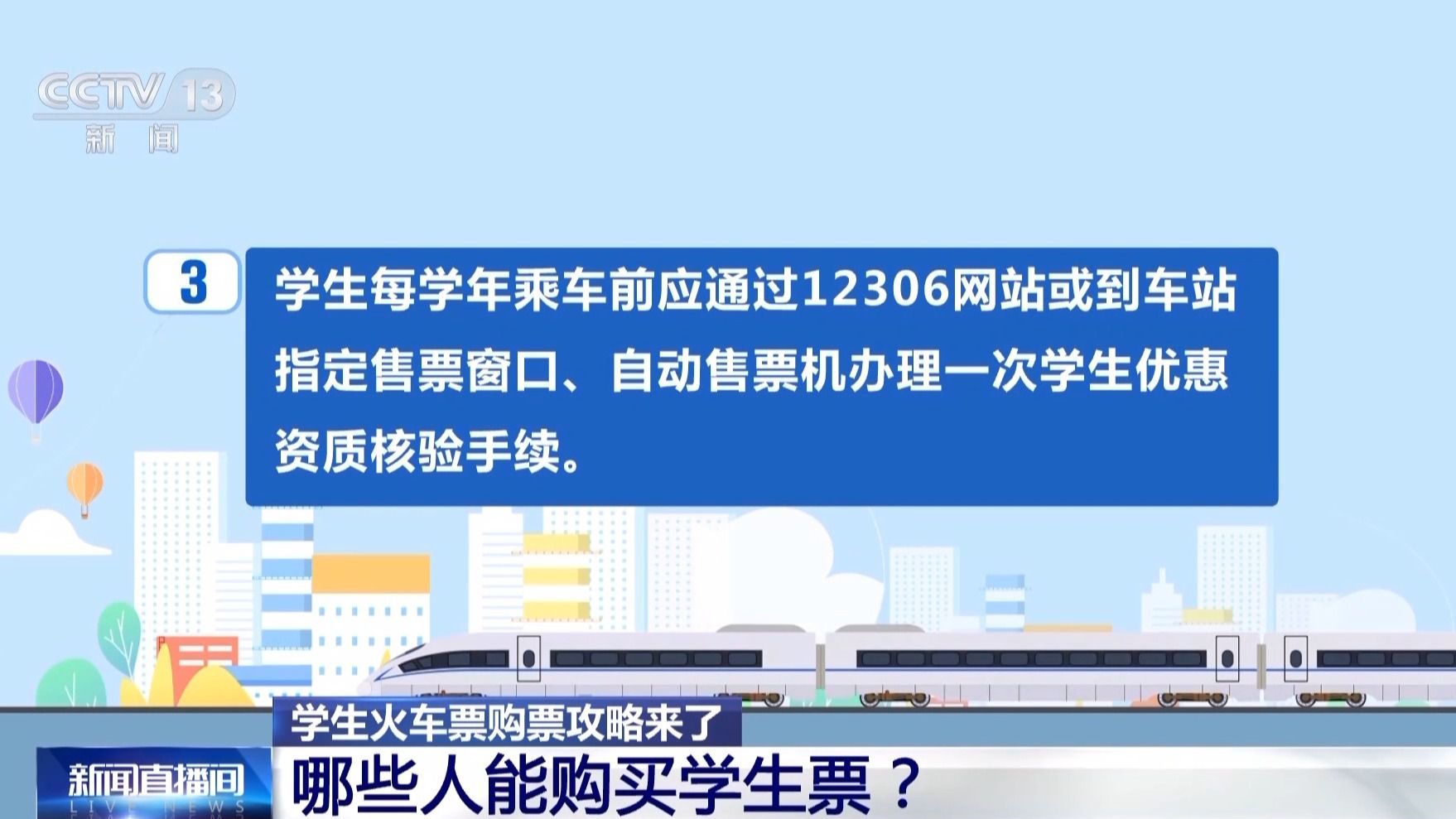 學(xué)生每學(xué)年乘車前應(yīng)通過(guò)12306網(wǎng)站或到車站指定售票窗口、自動(dòng)售票機(jī)辦理一次學(xué)生優(yōu)惠資質(zhì)核驗(yàn)手續(xù)。