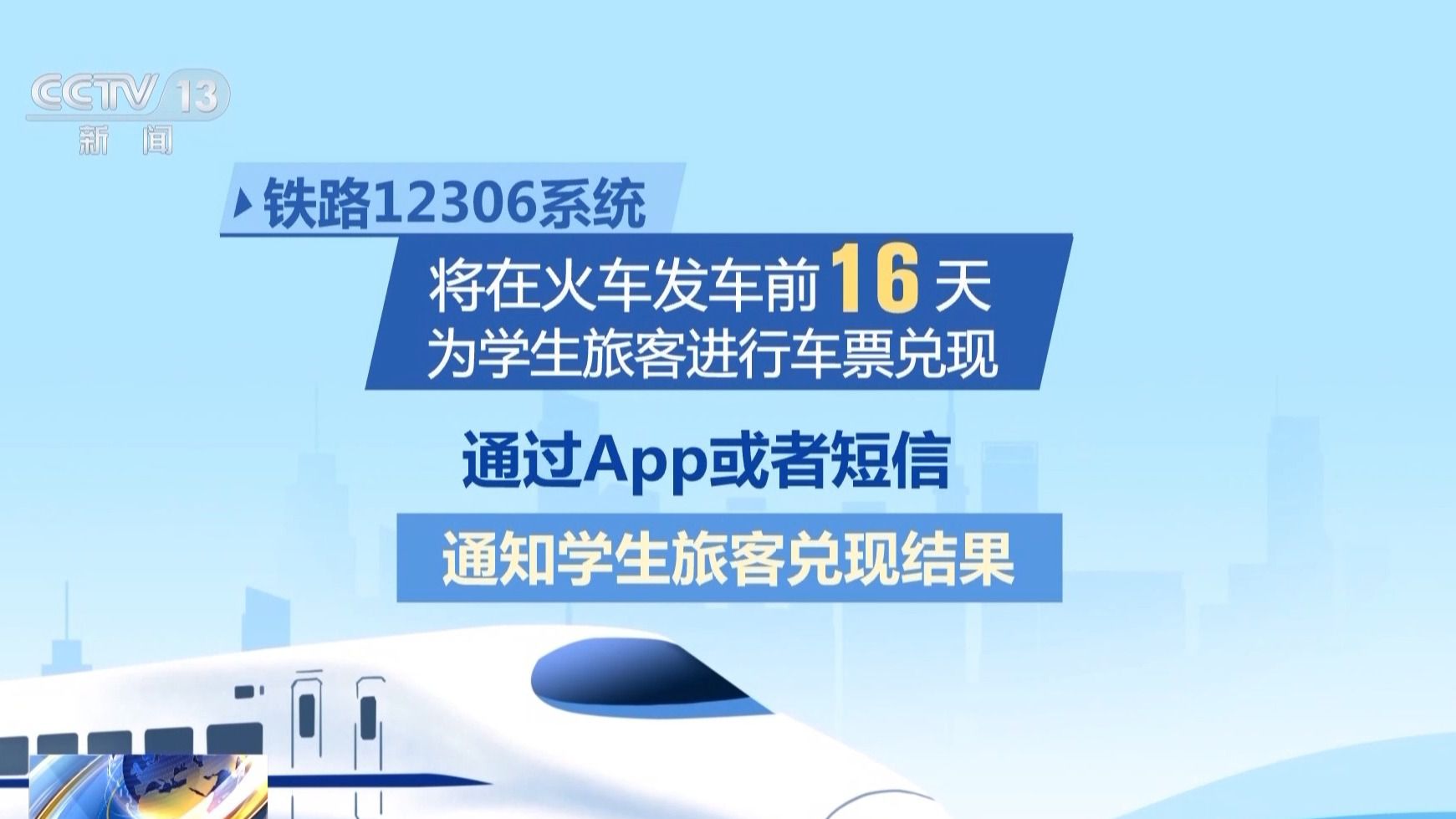 鐵路12306系統(tǒng)將在火車發(fā)車前16天為學(xué)生旅客進(jìn)行車票兌現(xiàn),并通過(guò)App通知或者短信通知學(xué)生旅客兌現(xiàn)結(jié)果。車票兌現(xiàn)成功后,學(xué)生旅客需在當(dāng)日23時(shí)前,在鐵路12306App中完成預(yù)約購(gòu)票訂單支付。