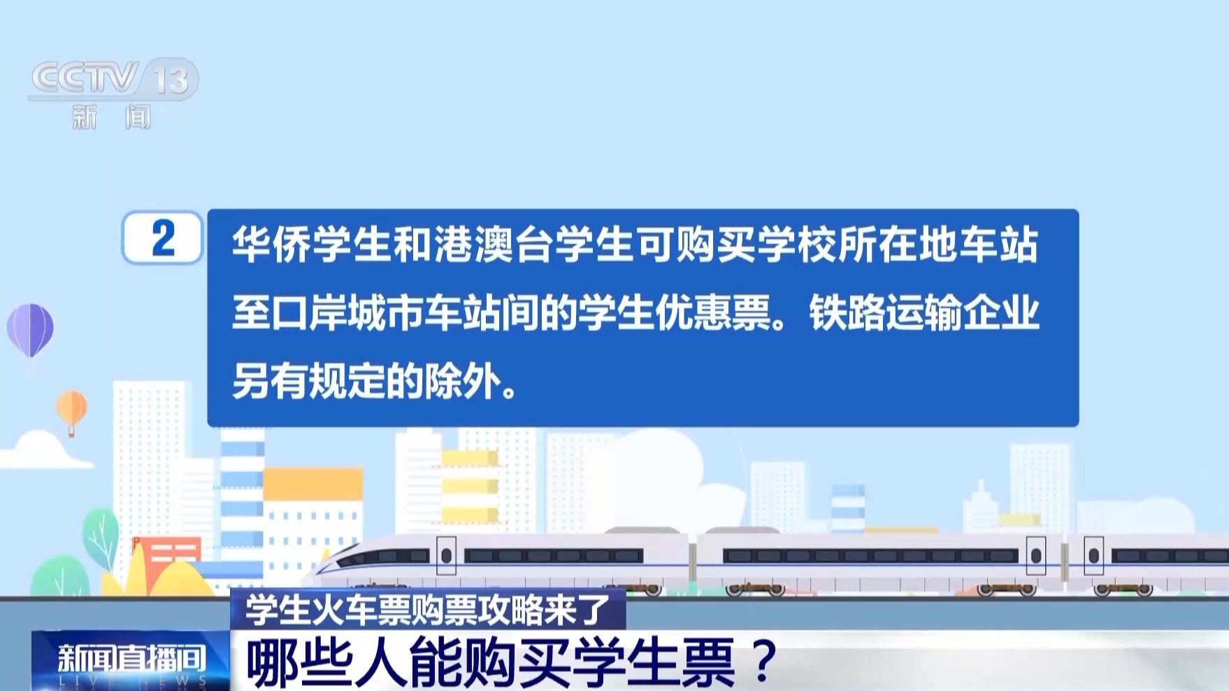 華僑學(xué)生和港澳臺(tái)學(xué)生可購(gòu)買學(xué)校所在地車站至口岸城市車站間的學(xué)生優(yōu)惠票。鐵路運(yùn)輸企業(yè)另有規(guī)定的除外。
