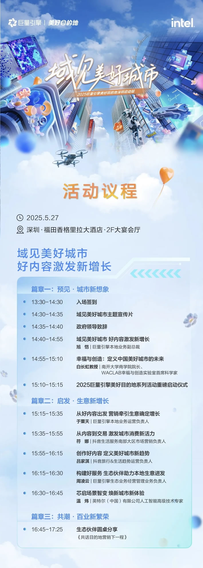 5月27日,關(guān)注2025巨量引擎美好目的地深圳啟動(dòng)站,一起吹爆美好目的地,激發(fā)文旅生意新可能!