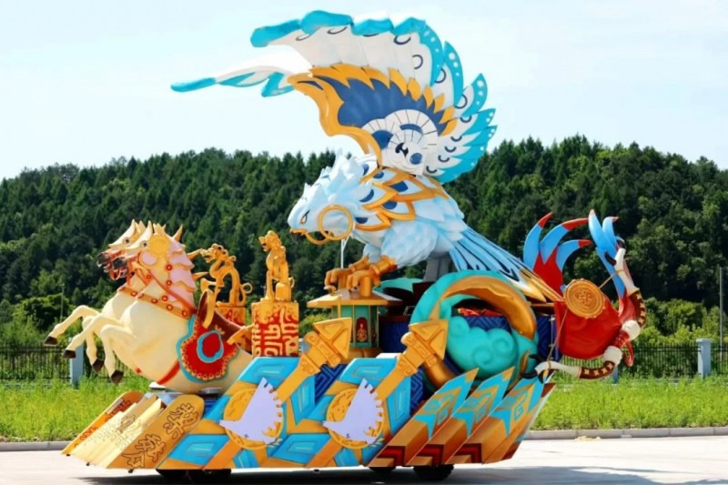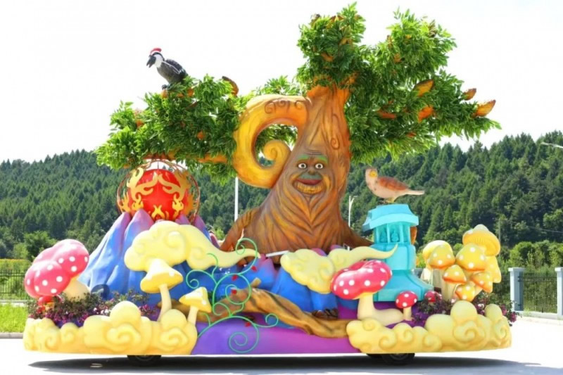 花車設(shè)計(jì)不僅注重視覺沖擊力,更融入動態(tài)特效:虎頭擺動、翅膀扇動、雪花機(jī)噴灑等細(xì)節(jié),讓靜態(tài)的造型煥發(fā)生命力。夜幕降臨時,花車更以夜光效果點(diǎn)亮林海,為觀眾呈現(xiàn)一場光影交織的奇幻盛宴。