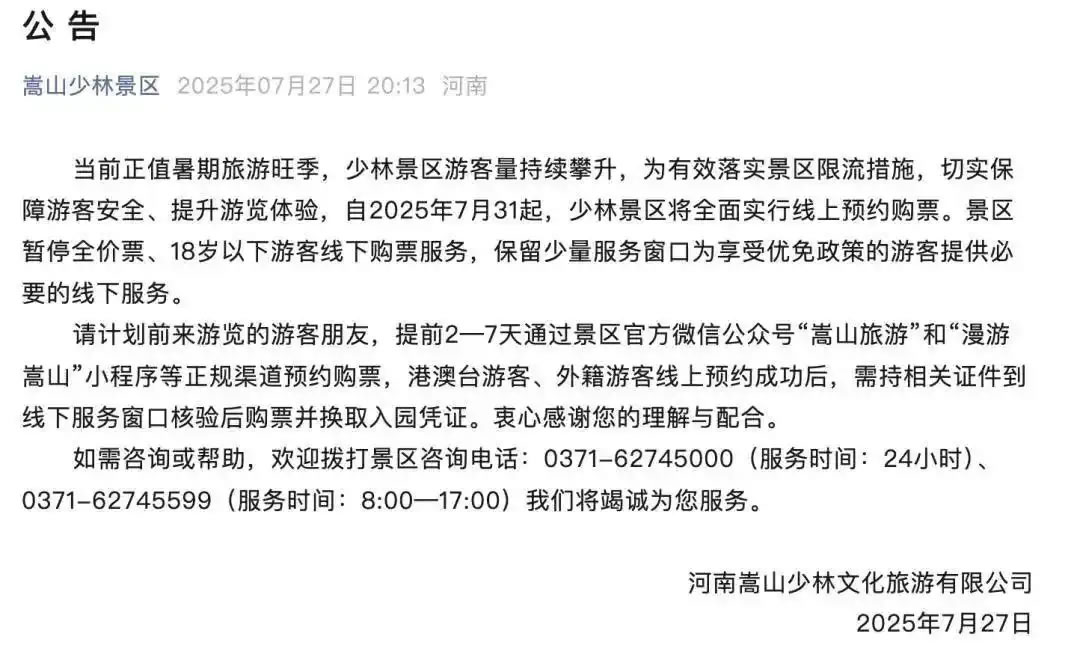 7月27日,嵩山少林景區(qū)官方公眾號(hào)發(fā)布最新消息顯示:當(dāng)前正值暑期旅游旺季,少林景區(qū)游客量持續(xù)攀升,為有效落實(shí)景區(qū)限流措施,切實(shí)保障游客安全、提升游覽體驗(yàn),自2025年7月31日起,少林景區(qū)將全面實(shí)行線上預(yù)約購(gòu)票。景區(qū)暫停全價(jià)票、18歲以下游客線下購(gòu)票服務(wù),保留少量服務(wù)窗口為享受優(yōu)免政策的游客提供必要的線下服務(wù)。