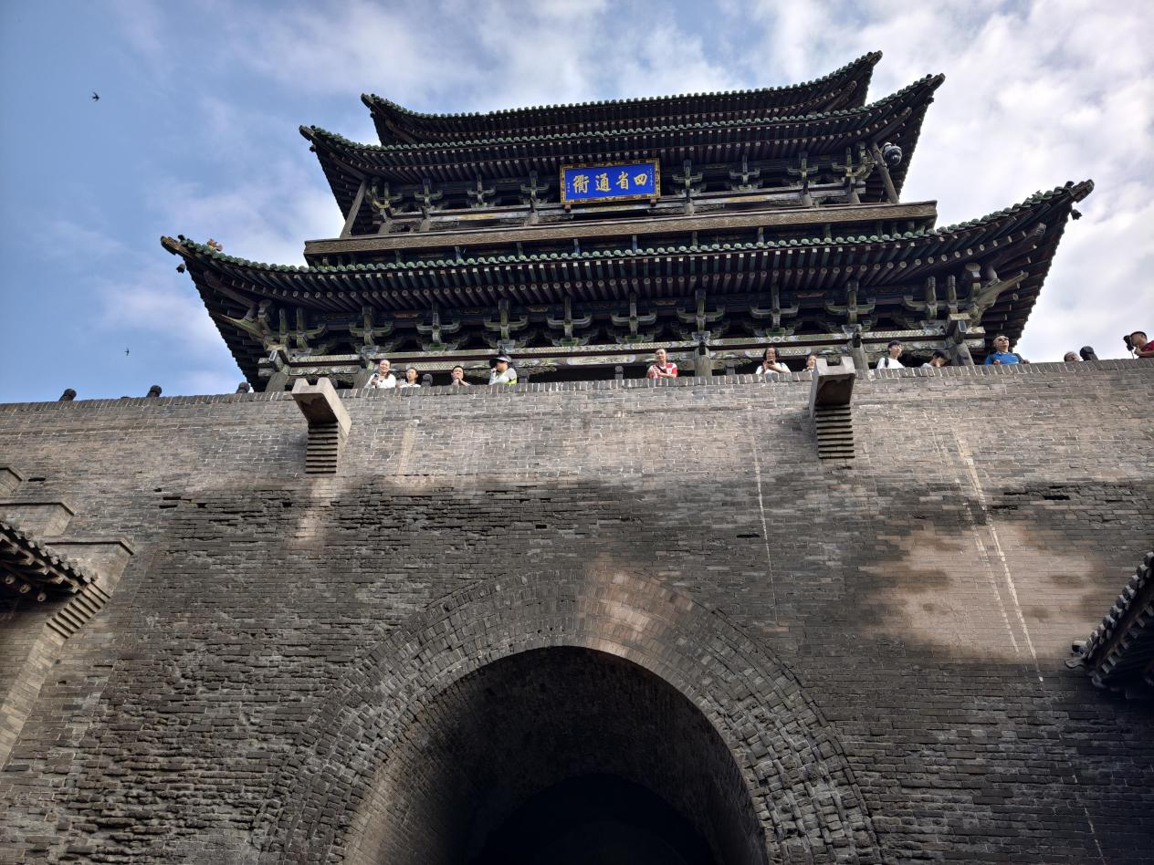 登上古城墻遠眺,6000多米長的城墻巍峨挺拔。據(jù)工作人員介紹,現(xiàn)在我們看到的城墻基本上保留了明代的建筑形制,外墻包磚內(nèi)墻夯土。古城內(nèi)以南大街為軸線,四大街、八小巷、七十二條蚰蜒巷縱橫交錯,民居、客棧、票號、鏢局等呈東西對稱分布。青磚路面以及上面深深的古車轍印,是古城“四省通衢”的重要見證。