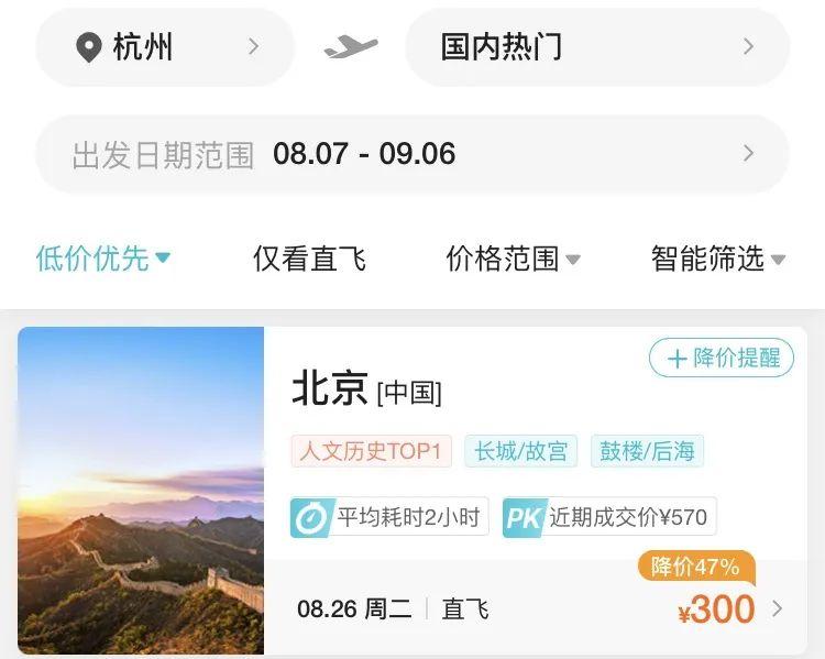 8月7日,記者查詢第三方售票平臺發(fā)現(xiàn),8月26日杭州飛北京經(jīng)濟艙機票價格僅需300元(不含稅),相當(dāng)于打了1.3折。8月13日,杭州飛揭陽經(jīng)濟艙票價最低僅需370元(不含稅),相當(dāng)于打3.1折。8月27日,杭州出發(fā)飛石家莊票價最低僅需330元(不含稅),相當(dāng)于打2折。