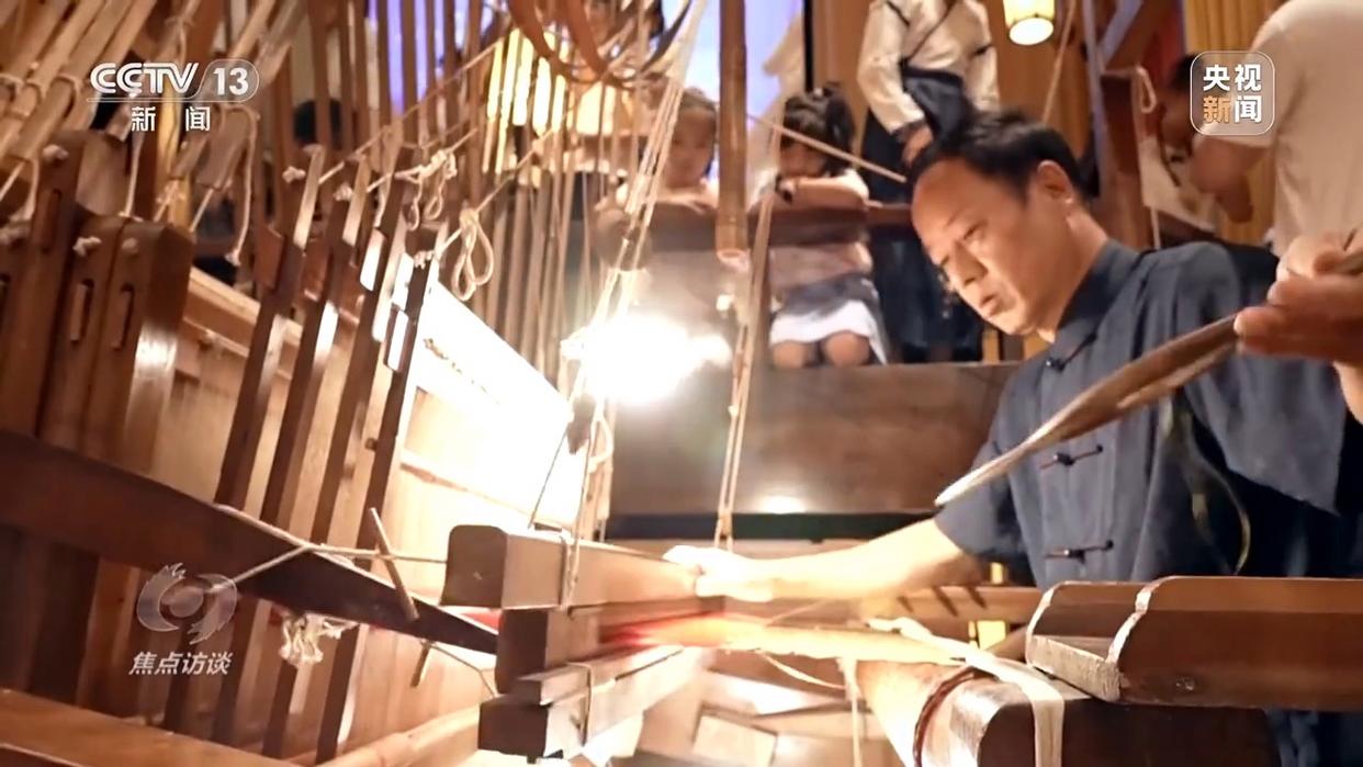 整個(gè)博物館最為壯觀的莫過(guò)于核心位置的大型蜀錦織造工場(chǎng),蜀錦非遺省級(jí)傳承人曹代武正帶領(lǐng)團(tuán)隊(duì),在一臺(tái)清代道光年間的小花樓木織機(jī)前,為游客們演繹著古老的織造技藝。這臺(tái)織機(jī)長(zhǎng)6米、高5米、寬1.5米,龐大的木質(zhì)“機(jī)甲”與機(jī)器上細(xì)如發(fā)絲的絲線形成強(qiáng)烈反差。兩位織機(jī)師傅默契配合、共同操作,方能織就那一幅幅絢麗奪目的蜀錦。