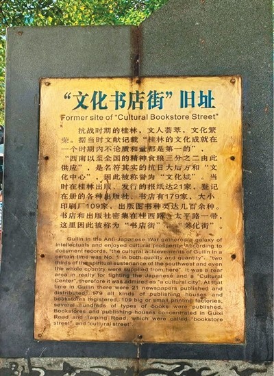 位于桂林市中心的解放西街,一座“文化書店街”舊址紀(jì)念碑在街角靜靜矗立。抗戰(zhàn)時期,這條街道曾有過另一個名字:桂西路。