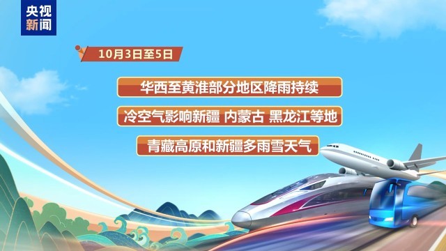 據(jù)中央氣象臺(tái)發(fā)布的消息,10月3日至5日,華西至黃淮一帶部分地區(qū)降雨持續(xù),冷空氣影響我國(guó)新疆、內(nèi)蒙古、黑龍江等地,青藏高原和新疆多雨雪天氣。公安部交通管理局提醒廣大駕駛?cè)撕统鲂腥罕,注意關(guān)注沿途及目的地氣象部門(mén)預(yù)報(bào)預(yù)警信息。