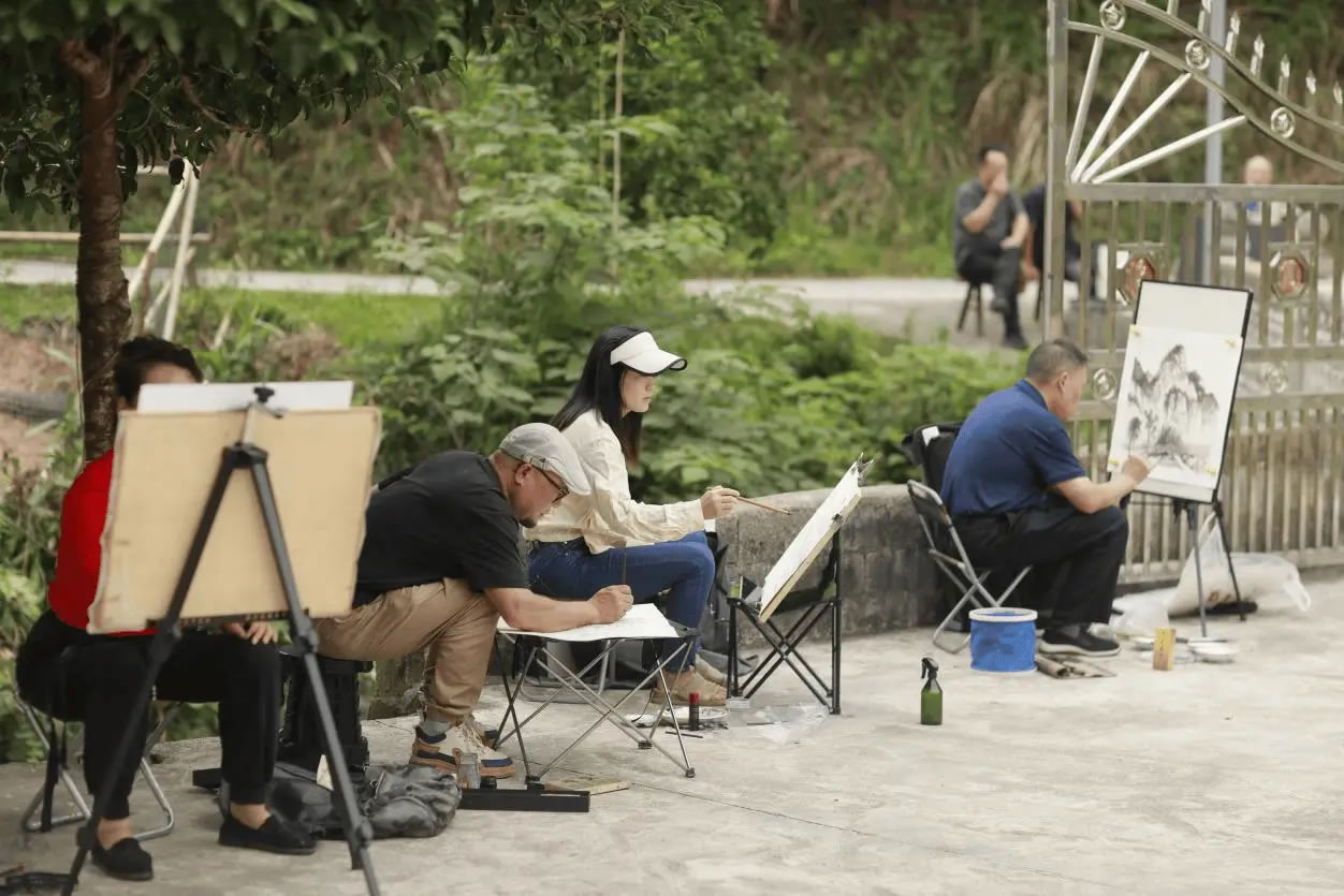 采風途中,藝術(shù)交流的氛圍格外濃厚。名家們時而圍站在一起,探討皴擦點染的技巧;時而各自凝神,將眼中的崀山轉(zhuǎn)化為筆下生動的線條與色塊。一幅幅即興創(chuàng)作的作品,在濃淡墨色的交融間,既展現(xiàn)了丹山碧水的壯闊,又傳遞了鄉(xiāng)村振興的蓬勃生機,讓崀山之美在宣紙絹素上綻放新韻。