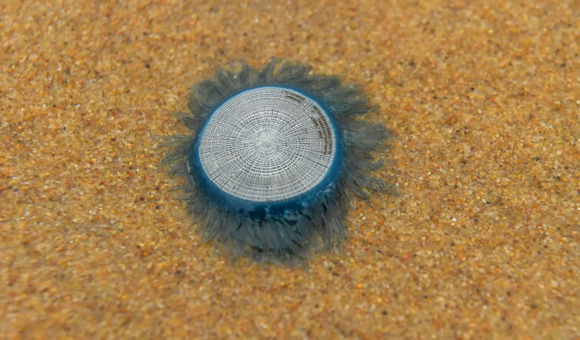 經(jīng)?谑匈Y規(guī)局聯(lián)同海南省海洋監(jiān)測預(yù)報中心專家取樣鑒定,這些圓形藍(lán)色生物為銀幣水母,其浮囊體硬而透明,質(zhì)輕呈圓盤狀,觸手上有刺絲囊,毒性相對較弱。該物種自身無游泳能力,其移動完全依賴海流驅(qū)動,本次銀幣水母上岸原因,或是受臺風(fēng)“風(fēng)神”影響,被強風(fēng)和大浪推上海岸。