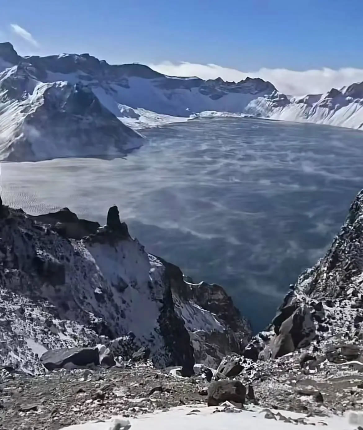 長白山景區(qū)的一位導(dǎo)游晚晚(化名)當天也目睹了“海浩”的奇觀。10月20日上午9點左右,她跟隨景區(qū)工作人員前往天池附近清理道路積雪,來到北坡一觀景臺處時,看到在大風吹拂下,凝結(jié)的水蒸氣正貼著天池的水面擴散、飄動。