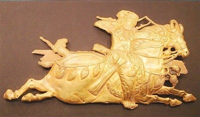 吐蕃騎射武士形飾牌造型威武,動感十足,格外引人注目。騎者纏頭巾,頭巾下方兩條發(fā)辮隨風飛舞,雙目圓瞪,嘴下有濃密的絡腮胡須;身穿緊身三角形大翻領長袍,雙手拉弓欲射,腰部系帶,其上垂掛箭囊,腰后露出刀柄。馬尾打有結扣,杏葉凌空飛動,氣勢撼人。金飾牌背面殘存帶黑漆皮的薄木片,上面有金釘將飾牌與木片定綴在一起,可知此飾牌原來應為某件木質器皿上的裝飾物。“這件飾牌的造型受到西亞薩珊王朝金銀器上的帝王狩獵圖影響,而騎士的裝束卻是吐蕃風格,體現(xiàn)了文化的交融。”趙婧說,青海省都蘭縣熱水墓群出土了相似的騎射形金飾片,亦為吐蕃時期的器物。
