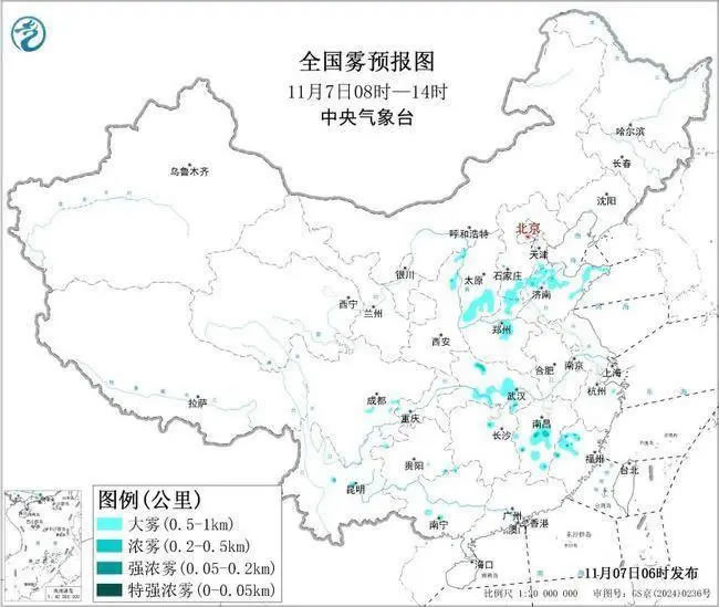 中央氣象臺(tái)今天(11月7日)06時(shí)繼續(xù)發(fā)布大霧黃色預(yù)警:預(yù)計(jì),7日早晨至上午,河北南部、河南中北部、山東北部和東部、山西南部、湖北南部、江西中部、福建西北部等地的部分地區(qū)有大霧,其中,山東東部、江西中西部、福建西北部等地的部分地區(qū)有能見度不足500米的濃霧,局地有能見度不足200米的強(qiáng)濃霧。