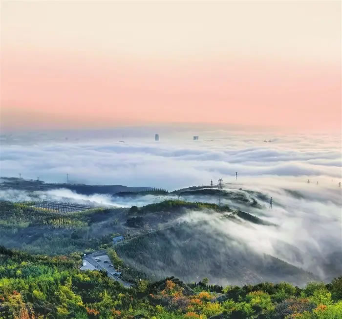 清晨6時許,市民高勁鵬與朋友驅(qū)車前往西山萬畝生態(tài)園。沿途霧氣彌漫,山路蜿蜒間,紅黃綠相間的植被頻頻躍入眼簾,偶有靈動的松鼠從山路旁躥出又疾速消失在馬路對面,遠(yuǎn)處山巒影影綽綽,“人在畫中游”的韻味十足。汽車快抵達(dá)山頂時,眼前的濃霧突然消散,淡藍(lán)色天空下,云海如流水般在城市上空鋪開。遠(yuǎn)處,云層翻涌似海浪;近處,沿山霧帶若玉帶流動,高壓電線塔頂端與零星高樓在霧中時隱時現(xiàn)。