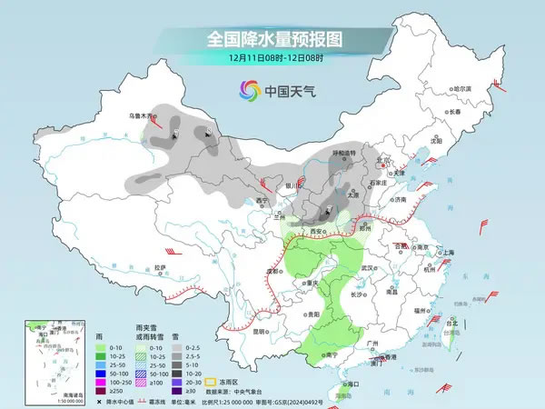 具體來看,今天,新疆沿天山地區(qū)和南疆盆地、西北地區(qū)中東部、內(nèi)蒙古西部、華北西部、黃淮西部等地部分地區(qū)有小到中雪或雨夾雪,其中,新疆沿天山地區(qū)和東部、陜西中北部等地部分地區(qū)有大雪。甘肅南部、陜西南部、湖北西部、湖南西部、四川盆地北部、重慶東南部、貴州東部、廣西大部、海南島、臺灣島等地部分地區(qū)有小雨。