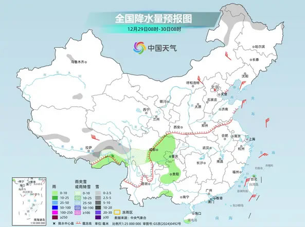2025年12月30日至2026年1月1日,西藏東部、西北地區(qū)東部、黃淮西部、江漢西部等地部分地區(qū)將有一次明顯雨雪天氣過程,陜西、山西、河南等地部分地區(qū)雨雪混雜。雨雪天氣或影響元旦假期出行,公眾外出需關(guān)注預(yù)警預(yù)報信息,駕車出行留出安全剎車距離,謹(jǐn)防道路濕滑。