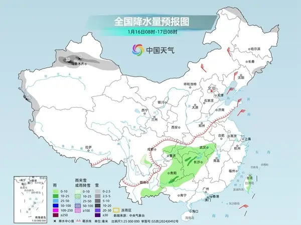 后天,新疆北部和西南部、西藏西部、黑龍江北部、四川西部等地部分地區(qū)有小到中雪或雨夾雪,其中,新疆沿天山地區(qū)和伊犁河谷等地部分地區(qū)有大雪或暴雪。湖北中南部、湖南西部和北部、重慶、貴州、廣西北部、云南南部等地部分地區(qū)有小到中雨。