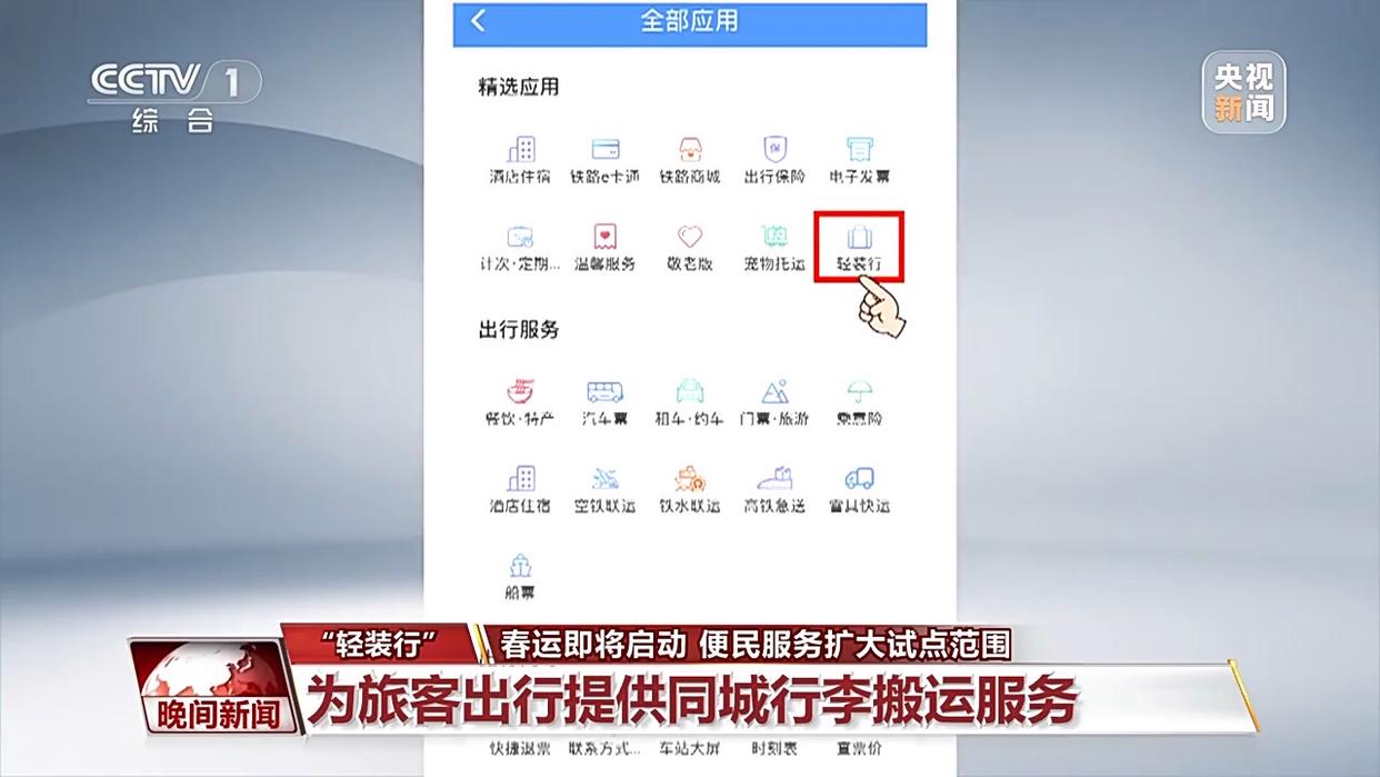 “輕裝行”是鐵路部門為旅客出行提供的“門到站”“站到門”同城行李搬運(yùn)服務(wù)。已購車票的旅客只需打開鐵路12306App或微信小程序,在首頁中部應(yīng)用欄向左滑動,找到“全部應(yīng)用”,點(diǎn)擊進(jìn)入即可找到“輕裝行”模塊,根據(jù)需求預(yù)約下單。