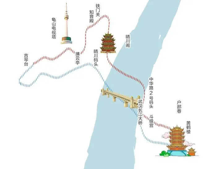 游線從蛇山黃鶴樓出發(fā),經(jīng)斗級營歷史街區(qū)、戶部巷美食區(qū),再乘坐輪渡橫渡長江,途中可觀賞長江大橋及兩岸風光,抵達漢陽后游覽晴川燈會,最終探訪龜山知音殿與古琴臺。線路雖短,卻集中展現(xiàn)武漢“半城山水半城詩”的城市意象。