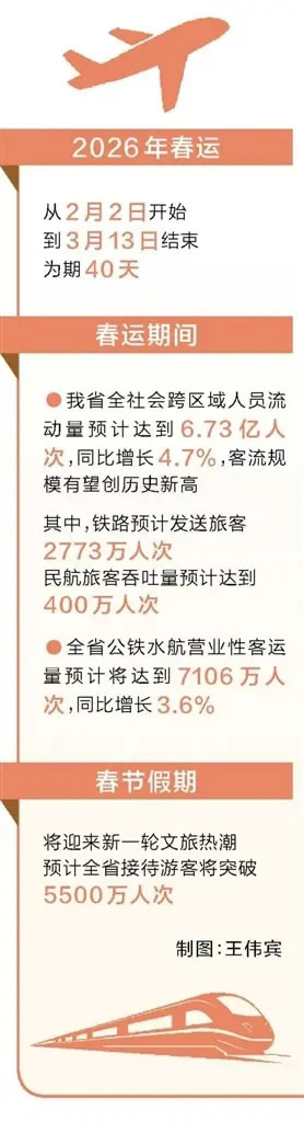 2026年春運(yùn)從2月2日開始,到3月13日結(jié)束,為期40天。今年春節(jié)是個(gè)“大年”,共有9天假期,預(yù)計(jì)群眾返鄉(xiāng)、探親、旅游的出行意愿將更加強(qiáng)烈。春運(yùn)期間,預(yù)計(jì)我省全社會跨區(qū)域人員流動量達(dá)到6.73億人次,同比增長4.7%,客流規(guī)模有望創(chuàng)歷史新高,其中鐵路預(yù)計(jì)發(fā)送旅客2773萬人次,民航旅客吞吐量預(yù)計(jì)達(dá)到400萬人次。