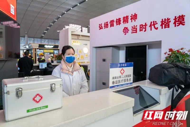 為保障春運(yùn)期間旅客健康出行,湖南多個車站升級了醫(yī)療服務(wù)措施。長沙南站聯(lián)合湖南省第二人民醫(yī)院,在“湘遇長南雷鋒服務(wù)站”設(shè)立了便民醫(yī)療點,配有醫(yī)護(hù)人員駐守,提供免費(fèi)的健康咨詢、醫(yī)療救護(hù)以及基礎(chǔ)應(yīng)急藥品與設(shè)備。