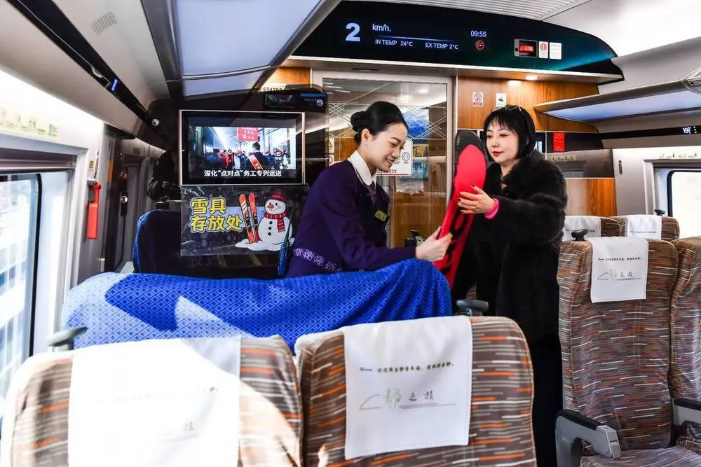 旅客可通過鐵路12306官方客戶端內(nèi)的“雪具便利行”功能,查詢服務(wù)車次、辦理預(yù)約并支付相關(guān)費(fèi)用后即完成辦理。辦理成功后,旅客可在乘車當(dāng)日將妥善包裝的雪具帶至車站,經(jīng)設(shè)有“雪具便利行”標(biāo)識(shí)的通道進(jìn)行安檢和驗(yàn)票,車站工作人員將同步核驗(yàn)車票與雪具運(yùn)送預(yù)約信息。上車后,旅客可在列車工作人員引導(dǎo)下,將雪具放置于鄰近的“雪具存放區(qū)”。列車運(yùn)行期間,工作人員將定時(shí)巡檢,共同保障雪具安全。